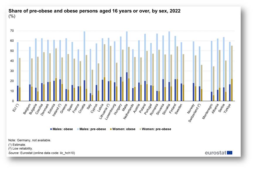 Übergewicht und Adipositas in Europa Übergewicht ist definiert mit einem BMI von 25 - 29,9kg/m2, Adipositas mi einem BMI ab 30,0kg/m2. Quelle: Eurostat – Overweight and obesity statistics. https://ec.europa.eu/eurostat/statistics-explained/index.php?title=Overweight_and_obesity_-_BMI_statistics#Context |