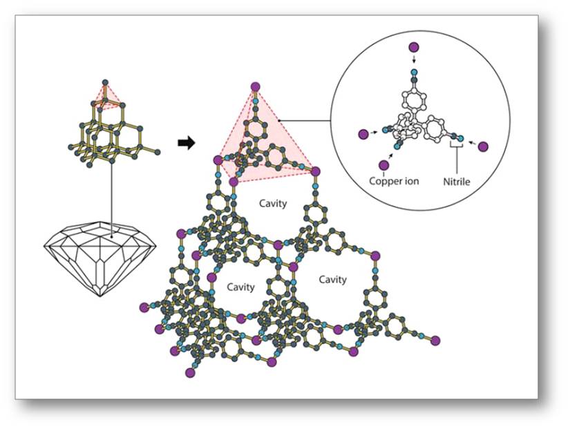 Der ursprünglich aus England stammende, seit 1966 an der Universität Melbourne lehrende Chemiker Richard Robson (*1937) stellte sich der Herausforderung aus ausgewählten chemischen Bausteinen ausgedehnte Strukturen mit definierter Raumstruktur zu schaffen. Über viele Jahre probierte er an den damals ersten Kugel-Stäbchen Molekülmodellen (Kugeln repräsentierten die Atome, Stäbchen die Bindungen zwischen den Atomen), wie ausgedehnte geordnete Strukturen von Polymeren gestaltet werden könnten. Inspiriert von der Struktur des Diamanten, in der jedes Kohlenstoffatom in räumlicher Anordnung eines Tetraeders an jeweils vier andere C-Atome (im Winkel von 109,50) bindet (Abbildung 1 links), ahmte er diesen Aufbau mit zwei unterschiedlichen Bausteinen nach: er brachte positiv geladene Kupfer-Ionen (diese entsprachen den Kugeln im Molekülmodell), die ebenfalls in Tetraeder-Anordnung an jeweils vier andere Atome binden, mit einem relativ steifen, vierfach verzweigten organischen Molekül (abgekürzt: "Tetranitril") zusammen, das, entsprechend den Stäbchen im Molekülmodell, die Metalle verbinden sollte. Das Linker-Molekül sollte dabei über seine vier Nitril(-C≡N)-Gruppen an die Kupfer-Ionen andocken. Wie geplant organisierten sich Kupferionen und Tetranitrile tatsächlich zu einem geordneten dreidimensionalen kristallinen Gerüst von diamantähnlichem Aufbau. Abbildung 1.