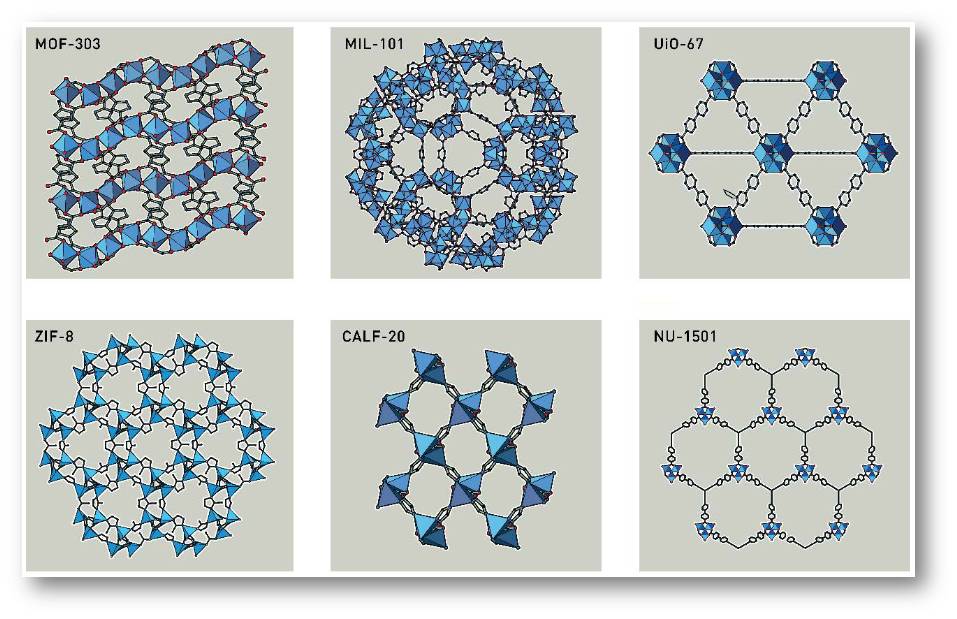 Abbildung 4: Beispiele für Gerüststrukturen: MOF-303 kann Wasser aus Luft mit niedriger Luftfeuchtigkeit in der Nacht aufnehmen, bei Erwärmung tagsüber freigeben.