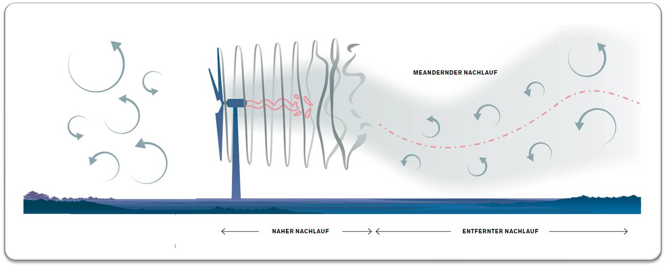 Eine turbulente, das heißt von Wirbeln geprägte Strömung bildet sich, wenn Gase oder Flüssigkeiten auf ein Hindernis treffen. Bei Schiffen, die durchs Wasser pflügen, geschieht das im Kielwasser. Der gleiche Effekt in der Luft wird als Nachlauf bezeichnet, oftmals wird aber auch das englische Wort Wake verwendet. Der Wake-Effekt tritt auch hinter Windrädern auf und spielt vor allem in Windparks eine große Rolle. Denn im Nachlauf eines Windrads trägt der Wind weniger Energie in sich. Die Windräder in den hinteren Reihen können somit weniger Strom erzeugen als die in der ersten Reihe. In großen Windparks kann das zu Verlusten von bis zu zehn Prozent führen. Erst in größerem Abstand zum Windrad nimmt die Strömung auf dessen Höhe wieder Fahrt auf. Dann schiebt die gerichtete und schnellere Strömung aus größerer Höhe die Luft in den oberflächennahen Schichten an. „Wann das genau passiert und wovon das abhängt, ist bisher noch nicht ganz klar. Denn hinter einem Windrad können ziemlich stabile Wirbel auftreten, und erst wenn diese zusammenbrechen, kann die energiegeladene Luft aus höheren Schichten einströmen“, sagt Claudia Brunner. Daher untersuchten sie und ihr Team, von welchen Bedingungen der Zusammenbruch der stabilen Wirbel abhängt.