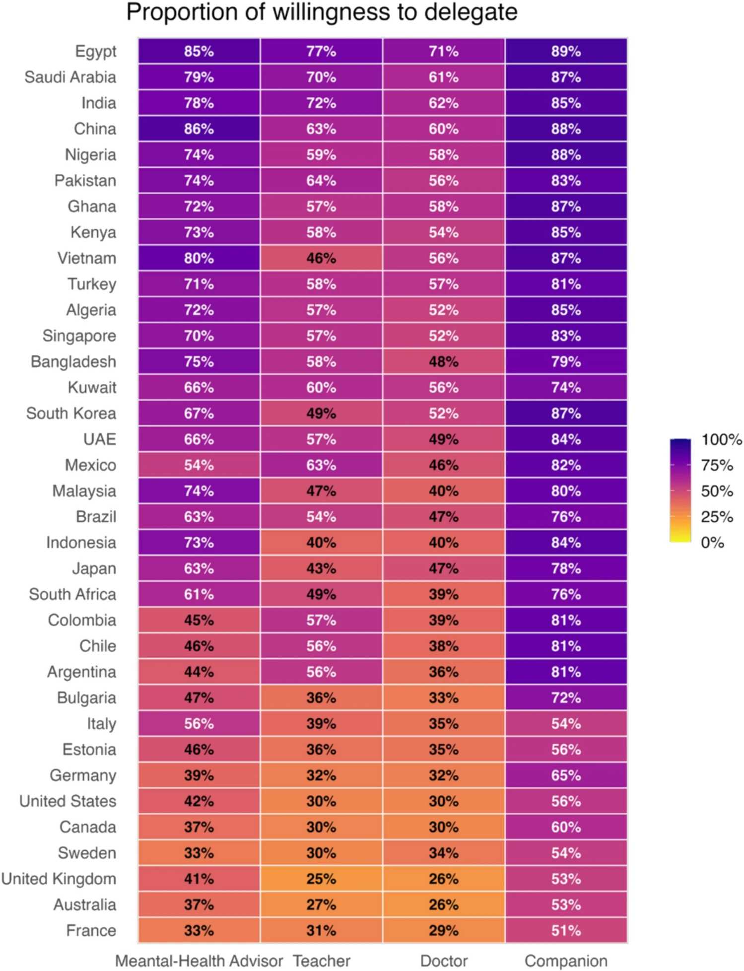 Abbildung 1. Länderweit verbreitete Bereitschaft wichtige Rollen an KI zu delegieren. Länder sind von der höchsten bis zur niedrigsten Delegation an KI als Begleiter geordnet. (Quelle: Abbildung 2. aus [1], Ala Yankouskaya et al. 2026. Lizenz: cc-by.) |