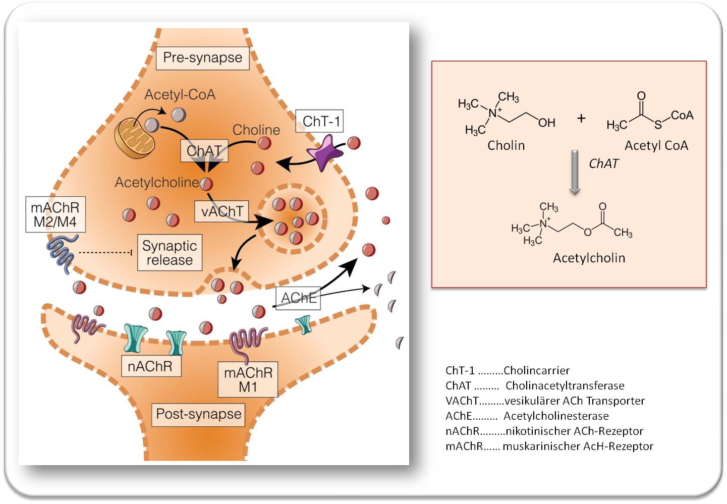 Mit zunehmendem Alter kommt es auch bei ansonsten gesunden Erwachsenen zu einem natürlichen Rückgang der kognitiven Funktionen. Diese stehen im Zusammenhang mit Störungen der sogenannten cholinergen Signalübertragung, d.i. mit Störungen des Systems von Synthese, Transport, Freisetzung, Rezeptorbindung und Inaktivierung des essentiellen Neurotransmitters und Neuromodulators Acetylcholin. Abbildung 1. Es gibt kaum eine Gehirnfunktion, die nicht zumindest teilweise von Acetylcholin beeinflusst wird. Die Acetylcholin-Signalübertragung ist maßgeblich in die Prozesse des Lernens, des Gedächtnisses, der Aufmerksamkeit und der Problemlösung involviert. An Tier- und Humanmodellen wurde bestätigt, dass eine Stimulierung der Acetylcholin-Freisetzung die kognitive Leistungsfähigkeit verbessert, eine Hemmung aber verschlechtert und die Fähigkeit (Plastizität) des Gehirns sich an Umweltbedingungen anzupassen verringert.