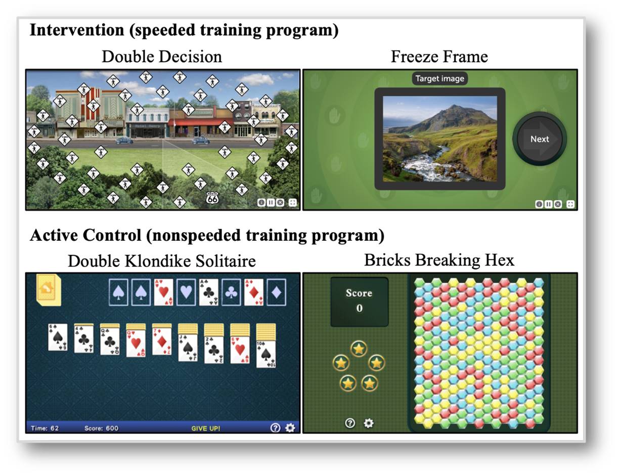 Abbildung 2. Geschwindigkeitstrainingsprogramme (Intervention) und aktive Kontrollprogramme. Die Intervention umfasste zwei Aufgaben des BrainHQ-Programms [2]: „Double Decision“, ein Programm, bei dem gleichzeitig visuelle Verarbeitungsgeschwindigkeit und Aufmerksamkeit trainiert werden. Die Teilnehmer nehmen einen im Zentrum präsentierten visuellen Reiz (hier ein Auto) wahr und lokalisieren gleichzeitig ein Zielobjekt im peripheren Gesichtsfeld, das an über 40 verschiedenen Stellen auftaucht, wobei die Anzeigedauer als adaptive Dimension sich dem Fortschritt des Benutzers anpasst. „Freeze Frame“, eine Übung zur schnellen und genauen Kontrolle von Aufmerksamkeit und Reaktionshemmung. Die Teilnehmer merken sich ein zu Beginn der Sitzung präsentiertes Zielbild, das von einem kontinuierlichen, mit unterschiedlicher Wahrscheinlichkeit erscheinendem Strom von Zielbild und Ablenkungsbildern gefolgt wird, wobei keine Reaktion auf das Zielbild, aber schnelle Reaktion auf Ablenkungsbilder erfolgen soll. Der zunehmende Schwierigkeitsgrad Zielbild und Ablenkungsbilder zu unterscheiden, passt sich dem Fortschritt des Benutzers an. Die aktive Kontrolle umfasste Abwandlungen von Unterhaltungssspielen: Double Klondike Solitaire, bei dem die Teilnehmer Karten nach Farben von Ass bis König auf 8 Ebenen verschieben und Bricks Breaking Hex, bei dem die Teilnehmer Gruppen von gleichfarbigen Steinen durch Anklicken eliminieren.(Bild: Figure 1 aus Attarha M. et al.,2025. doi: 10.2196/75161 [5]. Lizenz: cc-by)
