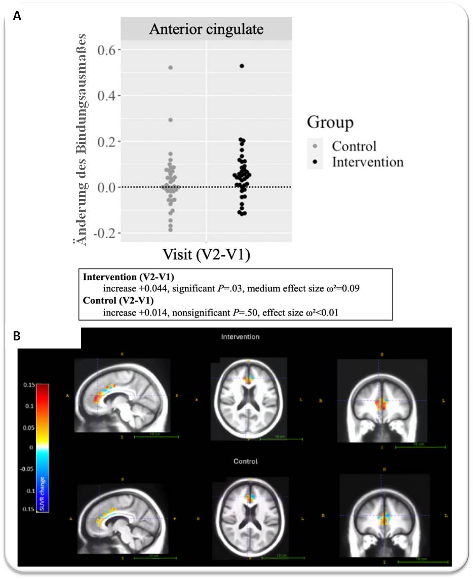wurden dann mittels PET auf die Bindung des [18F]-Radioliganden im anterioren cingulären Kortex untersucht und quantifiziert; diese Gehirnregion ist an einer Vielzahl von kognitiven Prozessen beteiligt, u.a. an Aufmerksamkeitsprozessen, Erkennen von Fehlern, Belohnungslernen, Entscheidungen und Verarbeitung von Schmerz. Die Messungen wurden zu Beginn der Studie, nach dem Test und anlässlich einer Nachuntersuchung 3 Monate später durchgeführt, um die Erhaltung beobachteter Effekte zu messen.