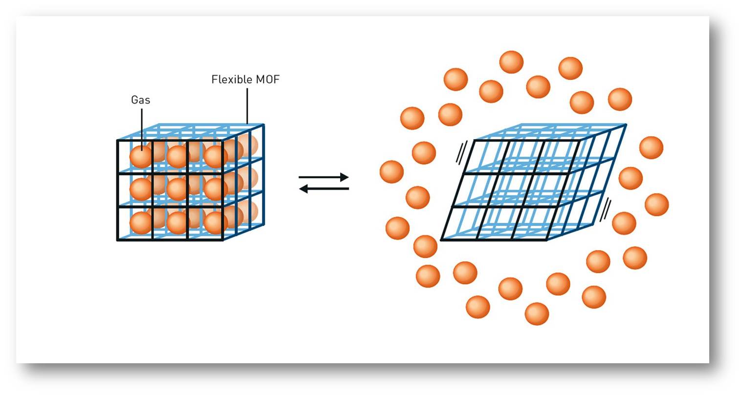 1998 postulierte Kitagawa dann, dass mit Hilfe von flexiblen molekularen Bausteinen auch biegsame MOFs - "weiche poröse Kristalle" - erzeugt werden könnten, dynamische Strukturen, die unter Einfluss von äußeren Stimuli wie u.a. Druck, Temperatur und Licht ihre Gestalt ändern. Abbildung 2. In Folge wurden zahlreiche derartige MOFs synthetisiert, die reversibel ihre Form ändern, wenn sie mit verschiedenen Substanzen beladen oder entladen werden.