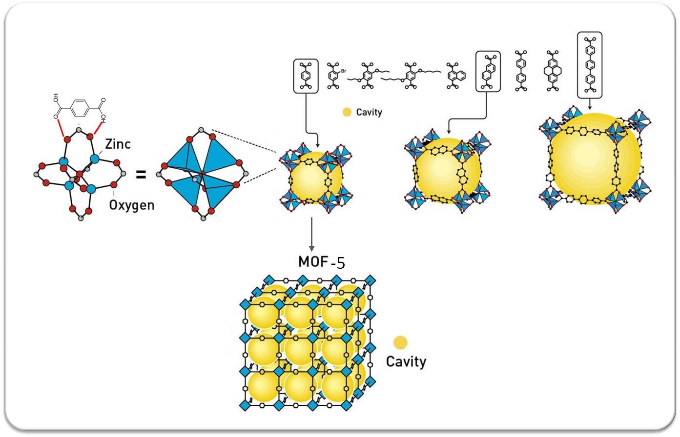 Omar M. Yaghi (*1960), der aus einer armen Familie in Jordanien stammt, hatte in den US studiert und dort Anfang der 1990er Jahre begonnen mit den damals neuen Methoden des "rational design" ausgedehnte metallorganische Gerüste zu erzeugen, indem er chemische Bausteine wie Legosteine miteinander verband. 1995 beschrieb er zweidimensionale Materialien, die durch Kupfer oder Kobalt zusammengehalten wurden, in ihren Zwischenräumen mit Molekülen beladen werden konnten und bis 3500C stabil waren.