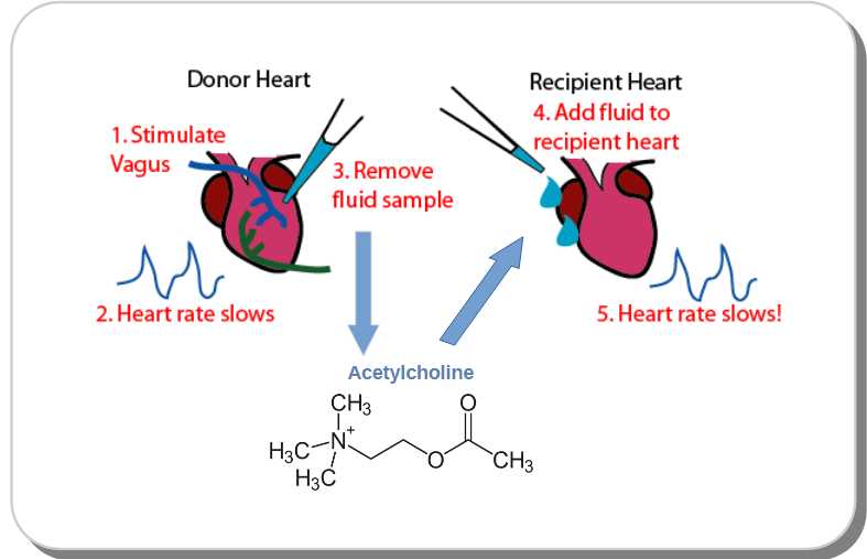 Es war damals, wie Dixon herausgefunden hatte, allgemein bekannt, dass das Herz eines Frosches für kurze Zeit weiter schlägt, wenn es in eine Lösung getaucht wird, welche die für die Aufrechterhaltung von elektrischen und mechanischen Aktivitäten notwendigen Ionen liefert. Loewi entnahm einem Frosch das Herz, beließ aber einen Teil des daran haftenden Vagusnervs. Er legte das Herz eines zweiten Frosches in einen separaten Behälter, aber in diesem Fall trennte er den Vagusnerv vollständig ab. Dann stimulierte er das Herz des ersten Frosches durch Anlegen von Strom und übertrug nach einigen Minuten einen Teil der Lösung, in der dieses Herz eingetaucht war, auf das zweite Herz. Der Schlag des zweiten Herzens verlangsamte sich, als hätte es ebenso Vagus-Stimulation erfahren. Dieses erstaunliche Experiment zeigte eindeutig, dass Nerven das Herz nicht direkt beeinflussen, da das zweite Herz keine anhaftenden Nerven hatte. Mit Loewis Worten: "Nerven müssen an ihren Enden bestimmte chemische Substanzen freisetzen, die wiederum die bekannten Veränderungen der Herzfunktion verursachen, die für die Stimulation ihres Nervs charakteristisch sind."